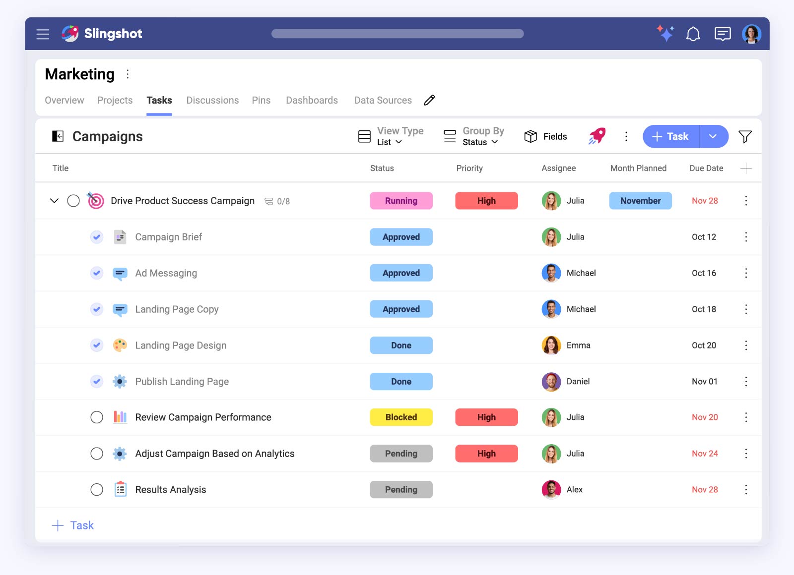 Slingshot gives you more than a board of “to-dos” and timelines. It’s your AI-powered control center where strategy, execution, and data come together.